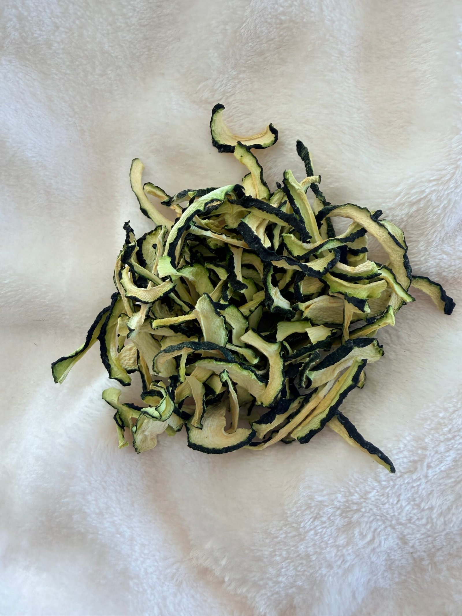 La courgette séchée est une friandise naturelle, riche en fibres et pauvre en calories, qui aide à la digestion tout en apportant des vitamines. Sa texture croquante plaît aux lapins