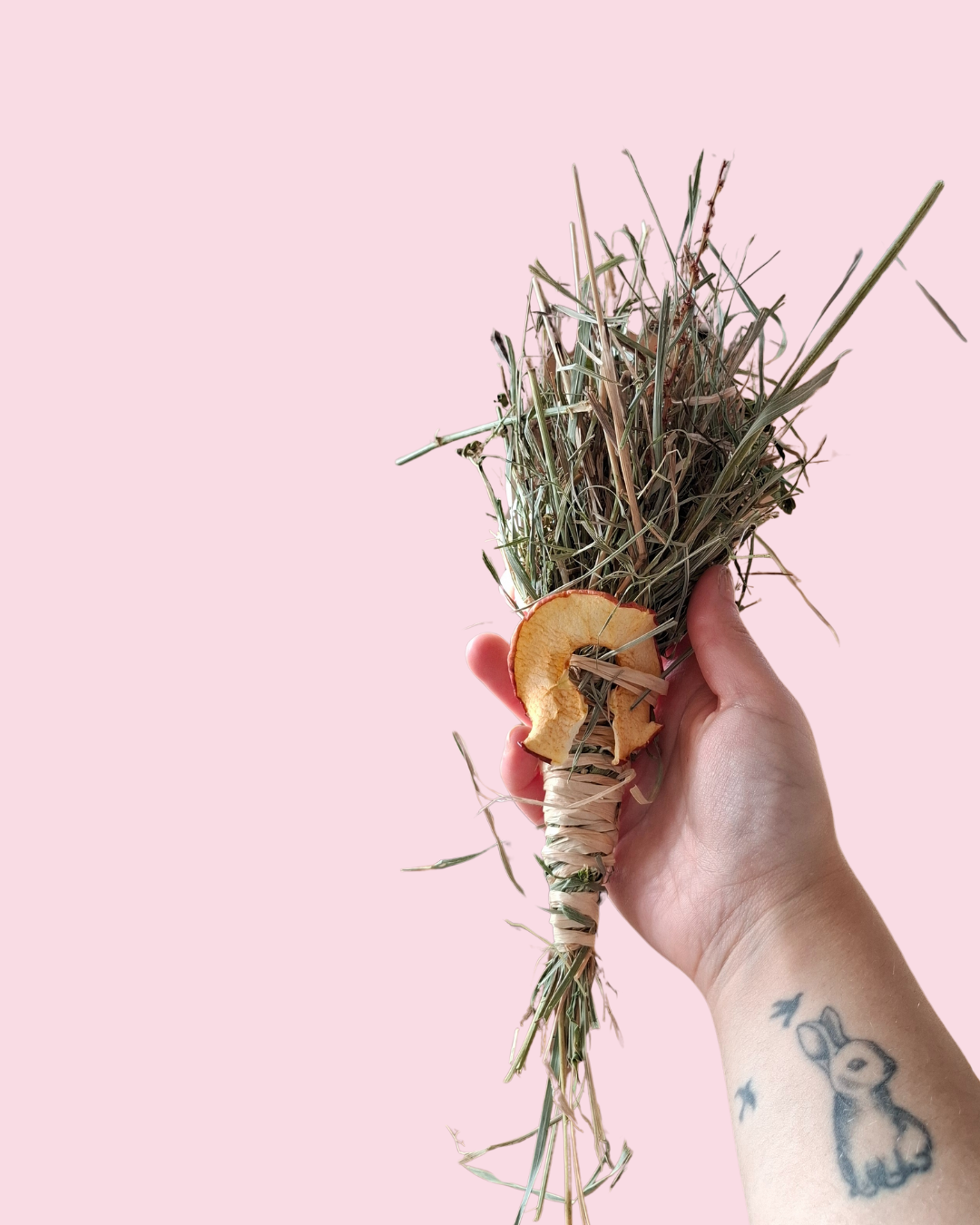 Confectionnée à partir de foin de prairie soigneusement sélectionné et liée avec du raphia naturel, elle renferme une tranche de pomme séchée pour une touche gourmande et fruitée.